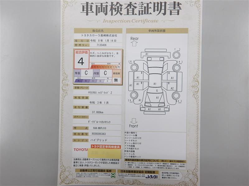 詳細及び現状の車両状態につきましては、店舗スタッフまでお尋ねください。 - 注2)上記と同様の評価点・状態表を「車両検査証明書」として店舗の展示車両に搭載しております。