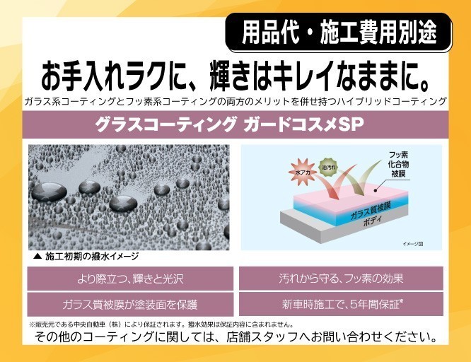 通常のロングラン保証1年に延長保証1年プラスし充実の保証内容に加え、2層のガラス質被膜により、輝き 光沢と滑落性・流水性による高い防汚効果のボディコーティング及び室内の清潔さ快適さを守る為の抗菌防臭コーティング、更にガラス4面に車台番号を刻印して盗難防止に役立つセーフティーコードを施工したセットプランです。 通常のロングラン保証1年に延長保証2年プラスし充実の保証内容に加え、2層のガラス質被膜により、輝き 光沢と滑落性・流水性による高い防汚効果のボディコーティング及び室内の清潔さ快適さを守る為の抗菌防臭コーティング、更にガラス4面に車台番号を刻印して盗難防止に役立つセーフティーコードを施工したセットプランです。