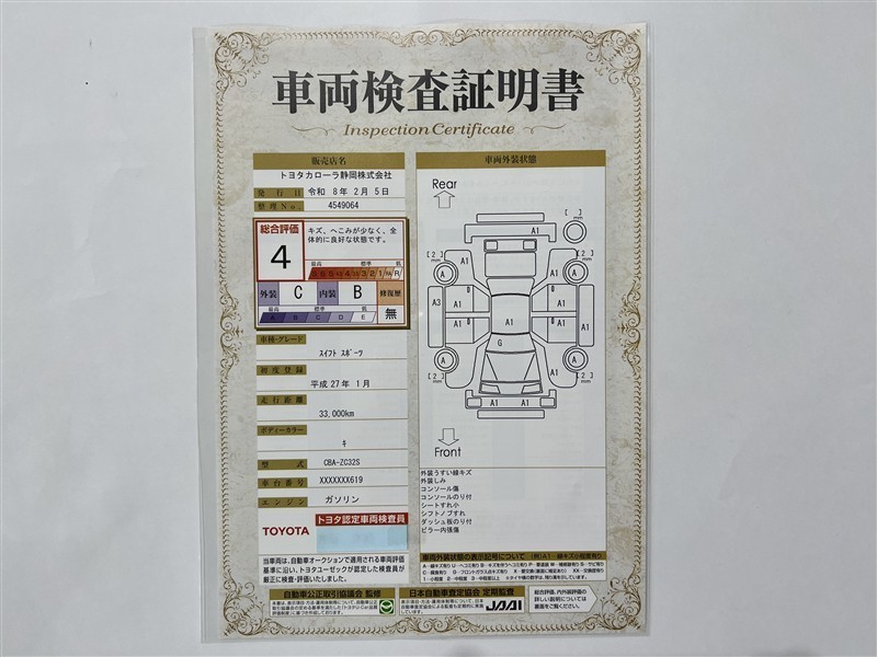 • 注2)上記と同様の評価点・状態表を「車両検査証明書」として店舗の展示車両に搭載しております。