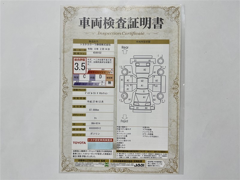 詳細及び現状の車両状態につきましては、店舗スタッフまでお尋ねください。 - 注2)上記と同様の評価点・状態表を「車両検査証明書」として店舗の展示車両に搭載しております。