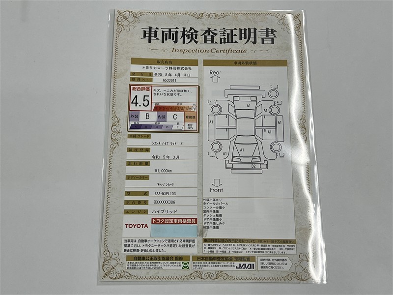 - 表示項目・方法・運用体制等について、自動車公正取引協議会の定める基準を満たした「トヨタU-Car品質評価制度」に基づき作成しております。
