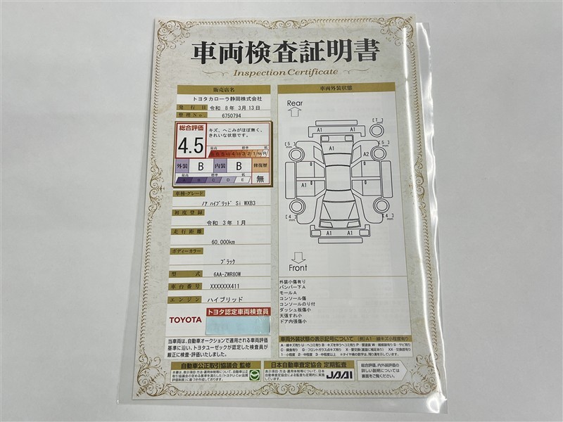 詳細及び現状の車両状態につきましては、店舗スタッフまでお尋ねください。 - 注2)上記と同様の評価点・状態表を「車両検査証明書」として店舗の展示車両に搭載しております。