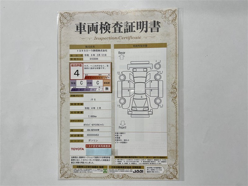 詳細及び現状の車両状態につきましては、店舗スタッフまでお尋ねください。 - 注2)上記と同様の評価点・状態表を「車両検査証明書」として店舗の展示車両に搭載しております。