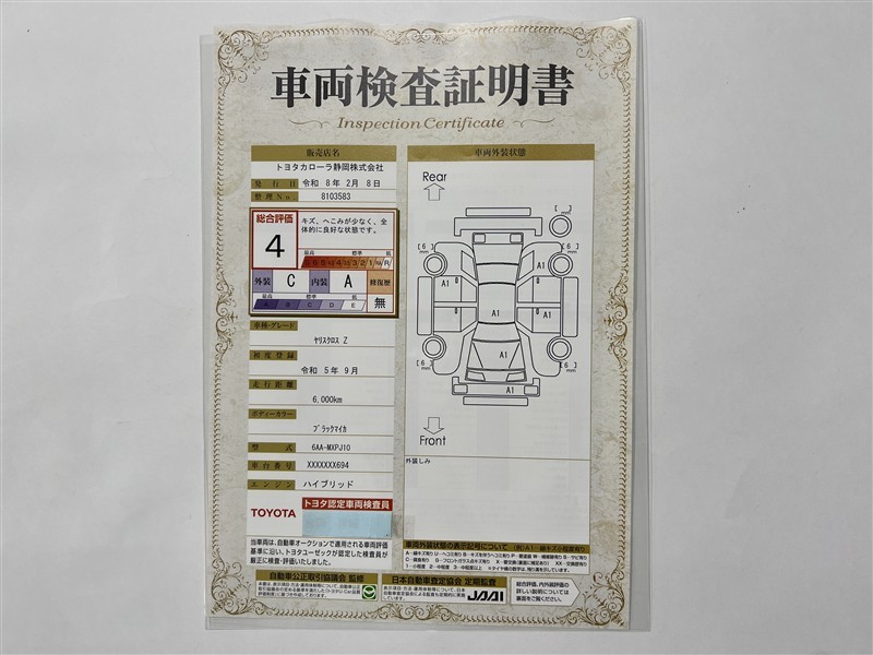 詳細及び現状の車両状態につきましては、店舗スタッフまでお尋ねください。 - 注2)上記と同様の評価点・状態表を「車両検査証明書」として店舗の展示車両に搭載しております。
