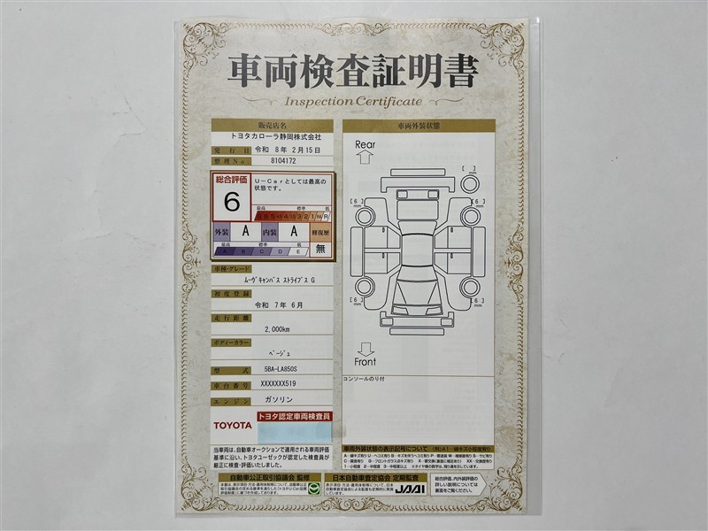| 総合評価 | 6 | U-Carとしては最高の状態です。(新車登録後3年未満、走行距離3万キロ以内で、中古車としては最高の状態です。) | ![]() |