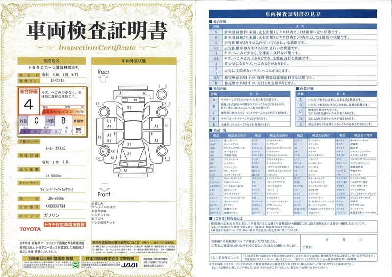 詳細及び現状の車両状態につきましては、店舗スタッフまでお尋ねください。 - 注2)上記と同様の評価点・状態表を「車両検査証明書」として店舗の展示車両に搭載しております。