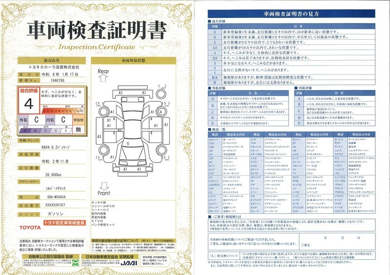 • 注2)上記と同様の評価点・状態表を「車両検査証明書」として店舗の展示車両に搭載しております。