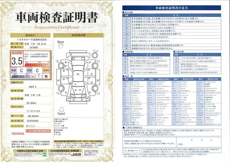 詳細及び現状の車両状態につきましては、店舗スタッフまでお尋ねください。 - 注2)上記と同様の評価点・状態表を「車両検査証明書」として店舗の展示車両に搭載しております。