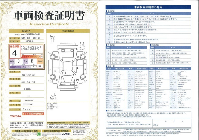 • 注2)上記と同様の評価点・状態表を「車両検査証明書」として店舗の展示車両に搭載しております。