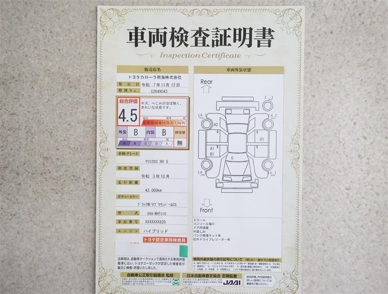 詳細及び現状の車両状態につきましては、店舗スタッフまでお尋ねください。 - 注2)上記と同様の評価点・状態表を「車両検査証明書」として店舗の展示車両に搭載しております。