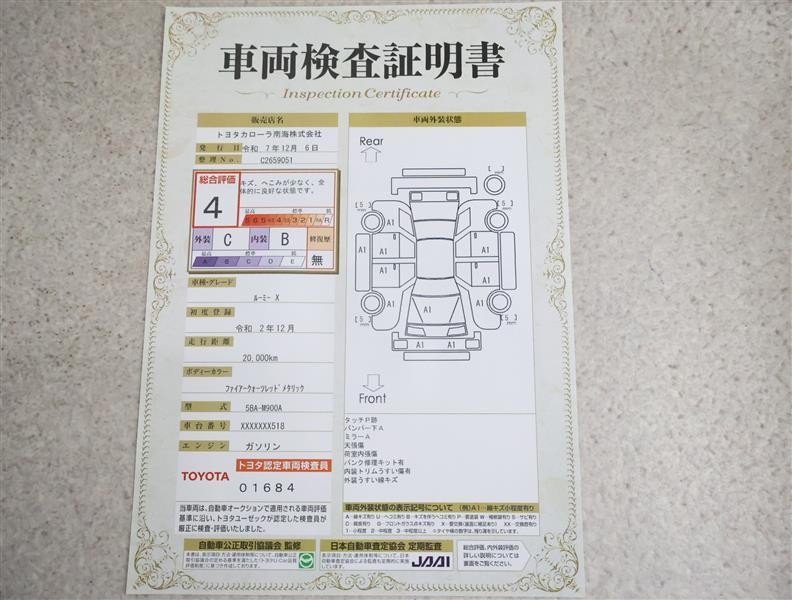 詳細及び現状の車両状態につきましては、店舗スタッフまでお尋ねください。 - 注2)上記と同様の評価点・状態表を「車両検査証明書」として店舗の展示車両に搭載しております。