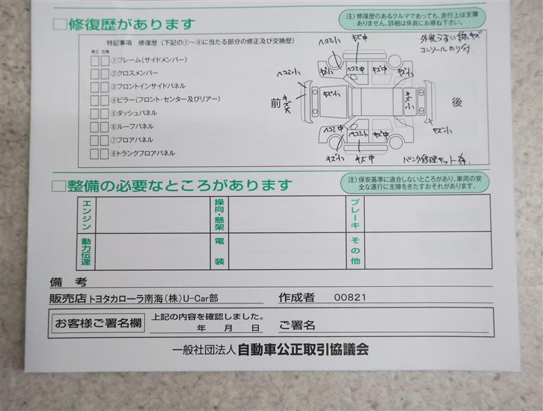 - 「修復歴あり」の場合、修復部位の詳細につきましては、販売店へお問合せください。