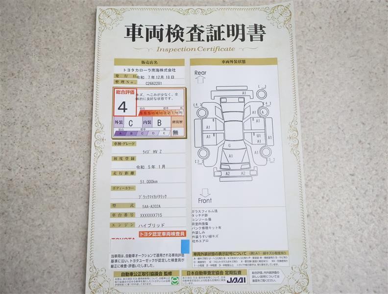 • 注2)上記と同様の評価点・状態表を「車両検査証明書」として店舗の展示車両に搭載しております。