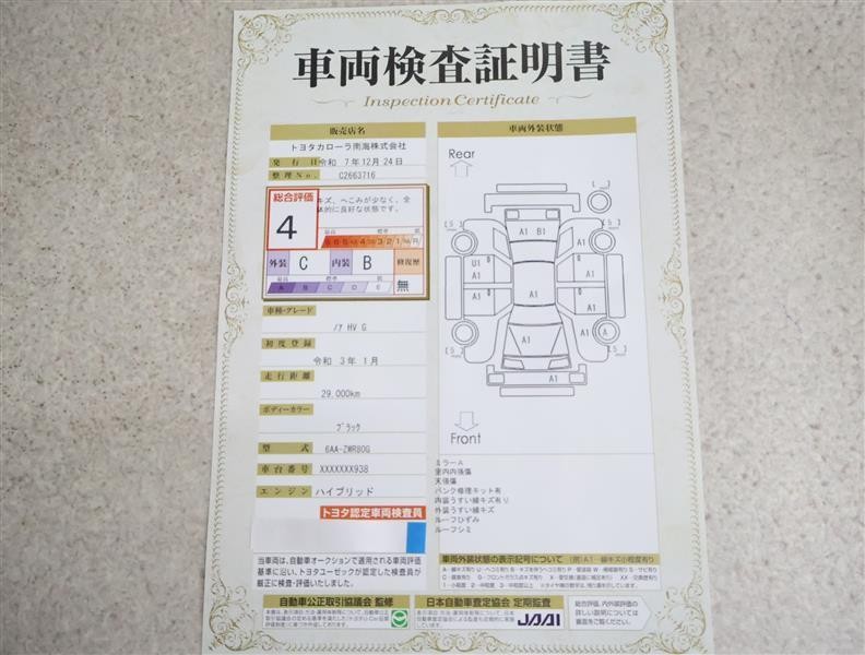 詳細及び現状の車両状態につきましては、店舗スタッフまでお尋ねください。 - 注2)上記と同様の評価点・状態表を「車両検査証明書」として店舗の展示車両に搭載しております。