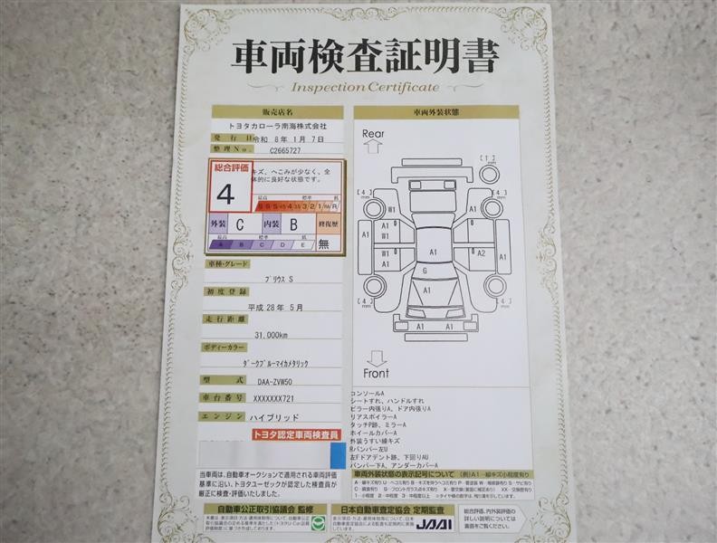 詳細及び現状の車両状態につきましては、店舗スタッフまでお尋ねください。 - 注2)上記と同様の評価点・状態表を「車両検査証明書」として店舗の展示車両に搭載しております。