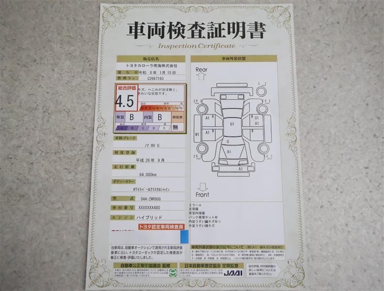 詳細及び現状の車両状態につきましては、店舗スタッフまでお尋ねください。 - 注2)上記と同様の評価点・状態表を「車両検査証明書」として店舗の展示車両に搭載しております。