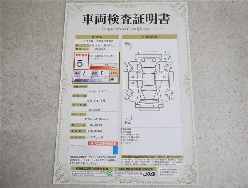 • 注2)上記と同様の評価点・状態表を「車両検査証明書」として店舗の展示車両に搭載しております。