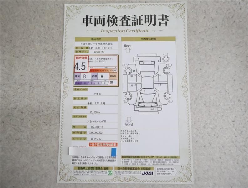 • 注2)上記と同様の評価点・状態表を「車両検査証明書」として店舗の展示車両に搭載しております。