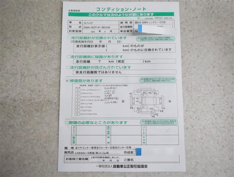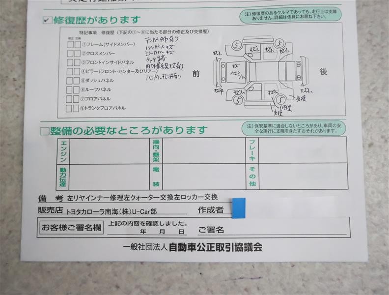 - 「修復歴あり」の場合、修復部位の詳細につきましては、販売店へお問合せください。