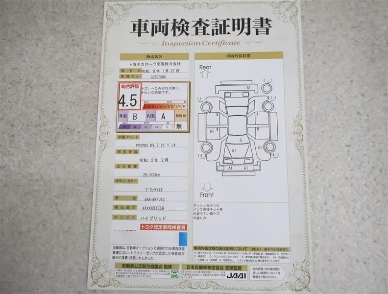 詳細及び現状の車両状態につきましては、店舗スタッフまでお尋ねください。 - 注2)上記と同様の評価点・状態表を「車両検査証明書」として店舗の展示車両に搭載しております。