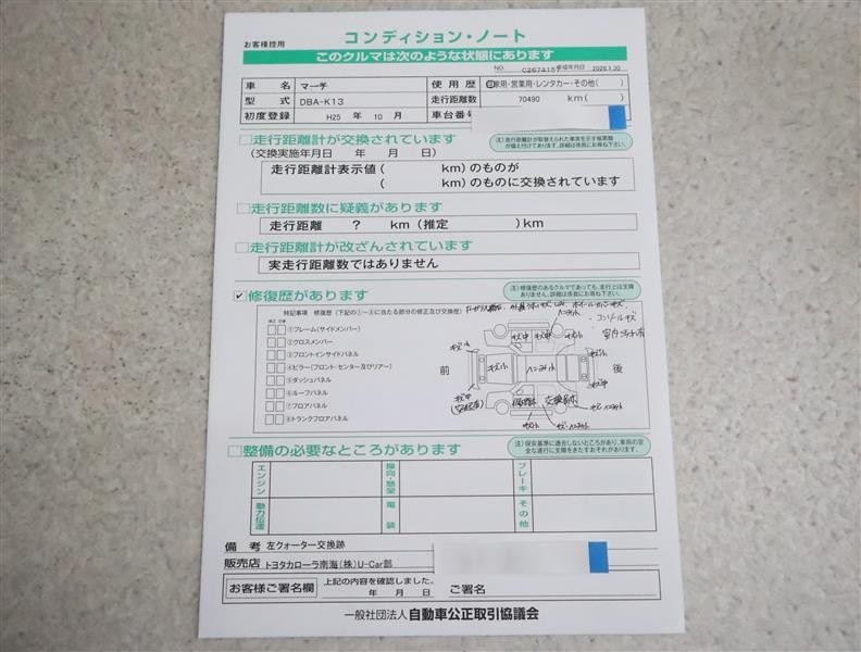 - 「定期点検整備なし(要整備箇所あり)」の場合、整備箇所につきましては、販売店へお問合せください。