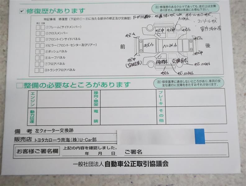 - 「修復歴あり」の場合、修復部位の詳細につきましては、販売店へお問合せください。