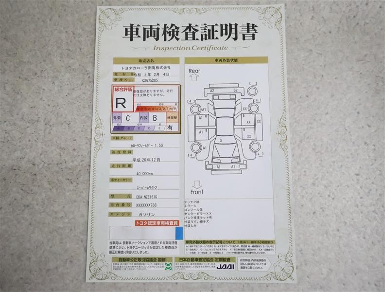 詳細及び現状の車両状態につきましては、店舗スタッフまでお尋ねください。 - 注2)上記と同様の評価点・状態表を「車両検査証明書」として店舗の展示車両に搭載しております。