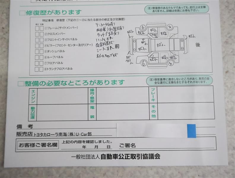- 「修復歴あり」の場合、修復部位の詳細につきましては、販売店へお問合せください。