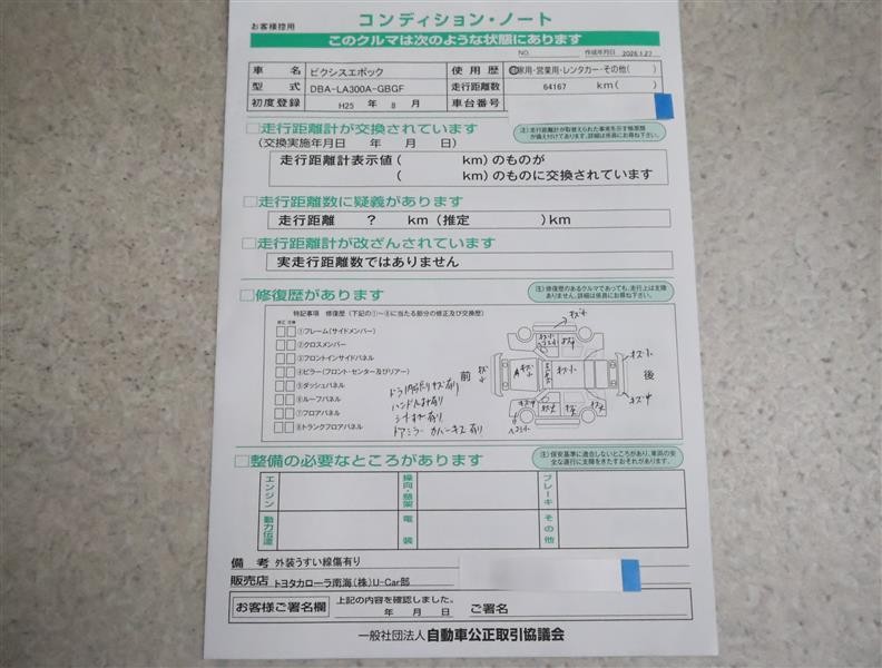 • 「定期点検整備なし(要整備箇所あり)」の場合、整備箇所につきましては、販売店へお問合せください。