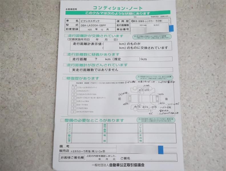 • 「定期点検整備なし(要整備箇所あり)」の場合、整備箇所につきましては、販売店へお問合せください。