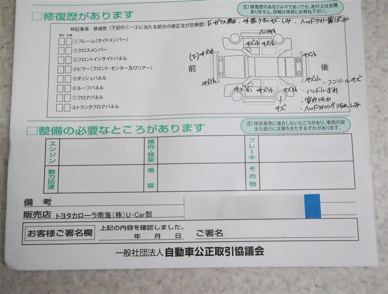 • 「修復歴あり」の場合、修復部位の詳細につきましては、販売店へお問合せください。