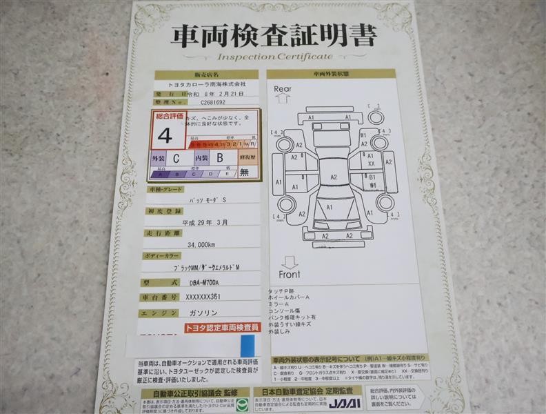 詳細及び現状の車両状態につきましては、店舗スタッフまでお尋ねください。 - 注2)上記と同様の評価点・状態表を「車両検査証明書」として店舗の展示車両に搭載しております。