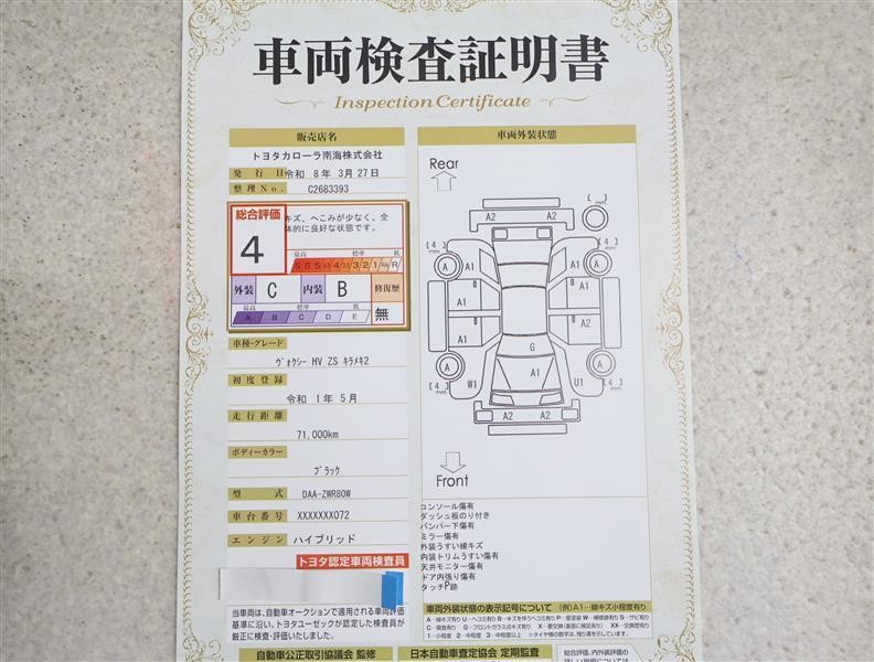詳細及び現状の車両状態につきましては、店舗スタッフまでお尋ねください。 - 注2)上記と同様の評価点・状態表を「車両検査証明書」として店舗の展示車両に搭載しております。