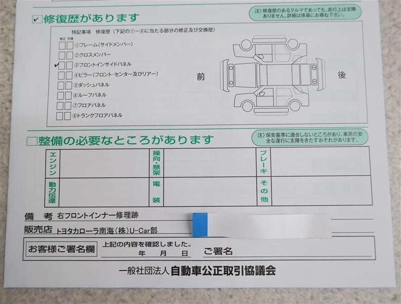 • 「修復歴あり」の場合、修復部位の詳細につきましては、販売店へお問合せください。
