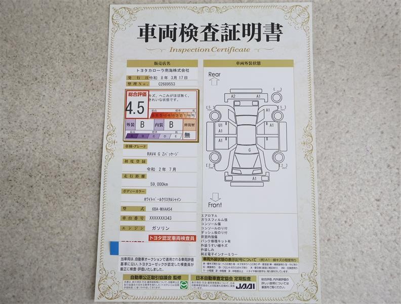 詳細及び現状の車両状態につきましては、店舗スタッフまでお尋ねください。 - 注2)上記と同様の評価点・状態表を「車両検査証明書」として店舗の展示車両に搭載しております。