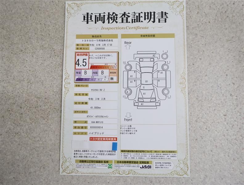 詳細及び現状の車両状態につきましては、店舗スタッフまでお尋ねください。 - 注2)上記と同様の評価点・状態表を「車両検査証明書」として店舗の展示車両に搭載しております。