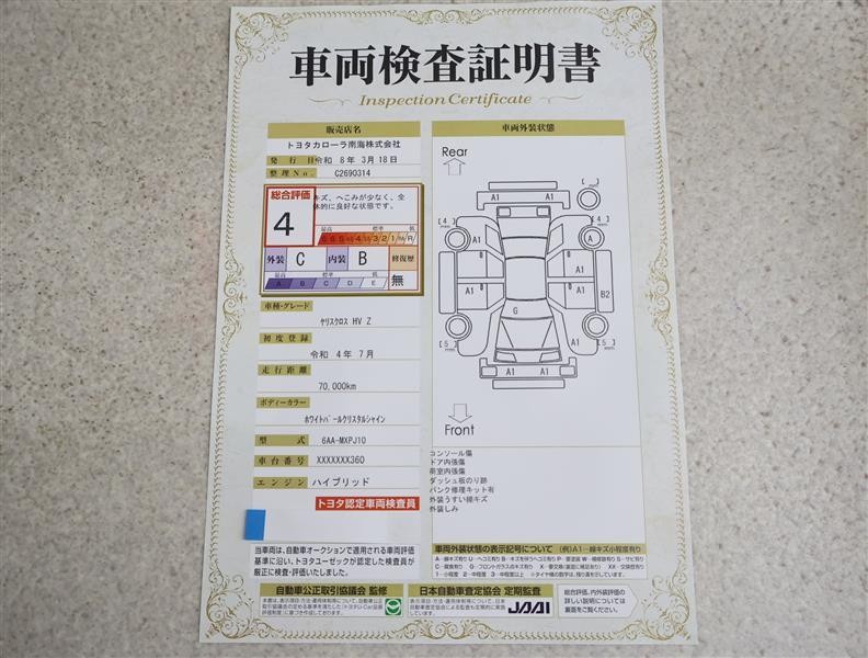 • 注2)上記と同様の評価点・状態表を「車両検査証明書」として店舗の展示車両に搭載しております。