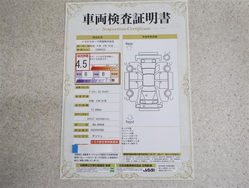 • 注2)上記と同様の評価点・状態表を「車両検査証明書」として店舗の展示車両に搭載しております。