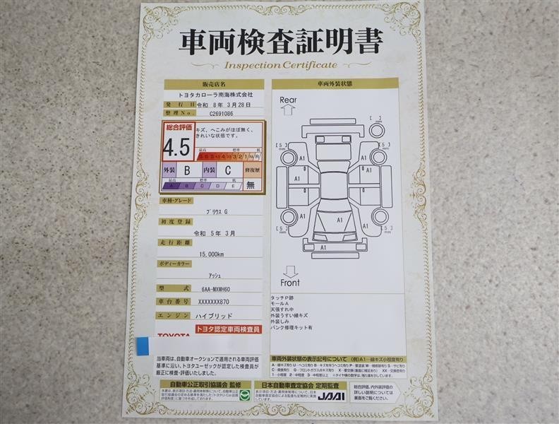 詳細及び現状の車両状態につきましては、店舗スタッフまでお尋ねください。 - 注2)上記と同様の評価点・状態表を「車両検査証明書」として店舗の展示車両に搭載しております。