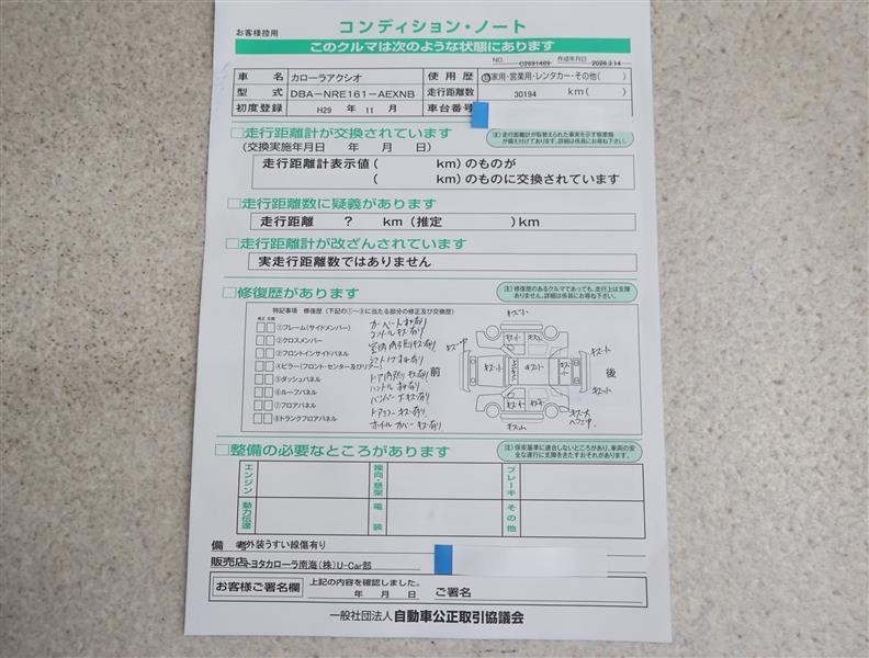 • 「定期点検整備なし(要整備箇所あり)」の場合、整備箇所につきましては、販売店へお問合せください。