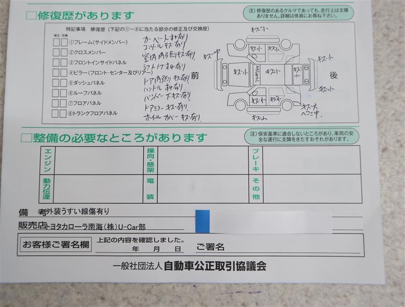 • 「修復歴あり」の場合、修復部位の詳細につきましては、販売店へお問合せください。