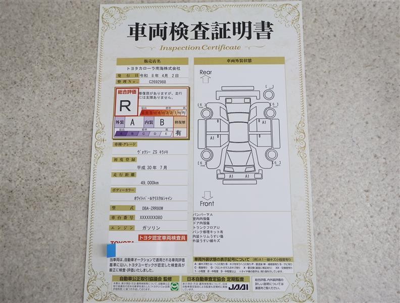 詳細及び現状の車両状態につきましては、店舗スタッフまでお尋ねください。 - 注2)上記と同様の評価点・状態表を「車両検査証明書」として店舗の展示車両に搭載しております。