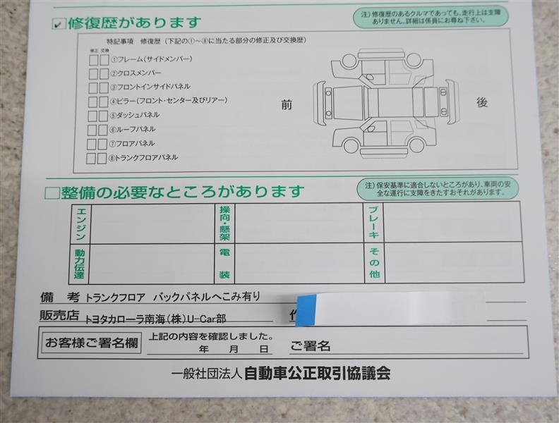 - 「修復歴あり」の場合、修復部位の詳細につきましては、販売店へお問合せください。