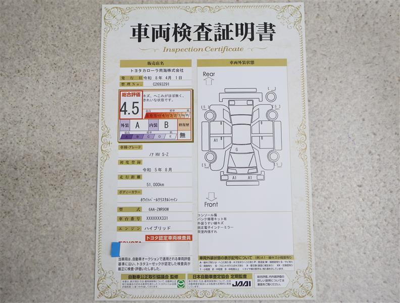 • 注2)上記と同様の評価点・状態表を「車両検査証明書」として店舗の展示車両に搭載しております。