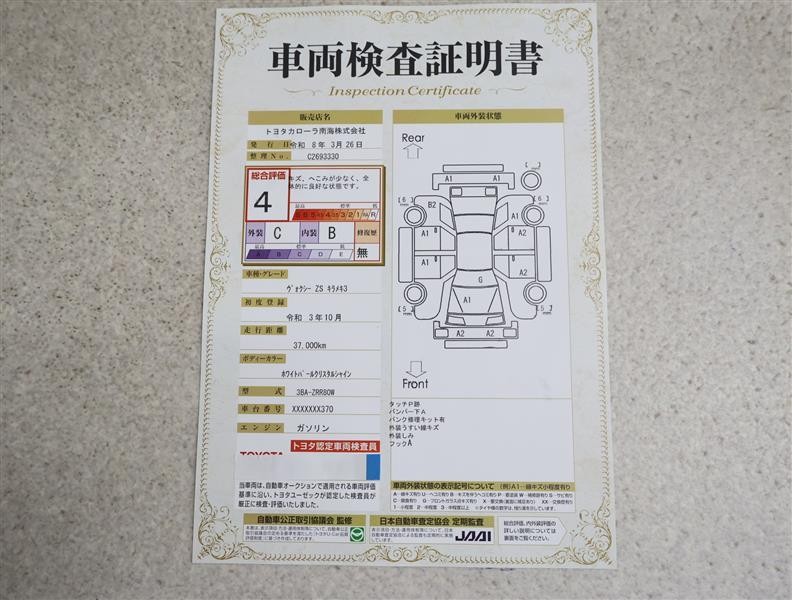 詳細及び現状の車両状態につきましては、店舗スタッフまでお尋ねください。 - 注2)上記と同様の評価点・状態表を「車両検査証明書」として店舗の展示車両に搭載しております。