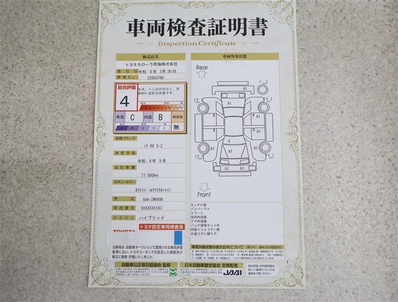• 注2)上記と同様の評価点・状態表を「車両検査証明書」として店舗の展示車両に搭載しております。