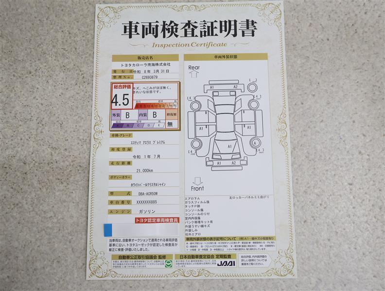 詳細及び現状の車両状態につきましては、店舗スタッフまでお尋ねください。 - 注2)上記と同様の評価点・状態表を「車両検査証明書」として店舗の展示車両に搭載しております。