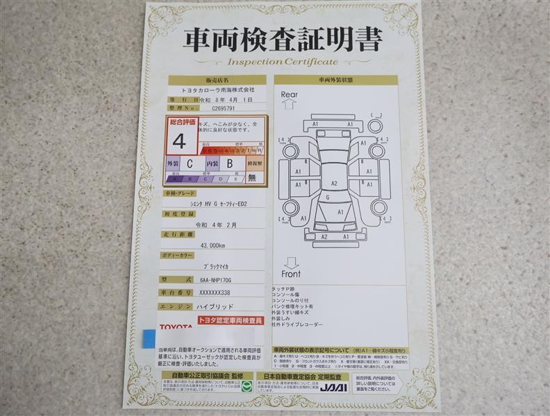 詳細及び現状の車両状態につきましては、店舗スタッフまでお尋ねください。 - 注2)上記と同様の評価点・状態表を「車両検査証明書」として店舗の展示車両に搭載しております。