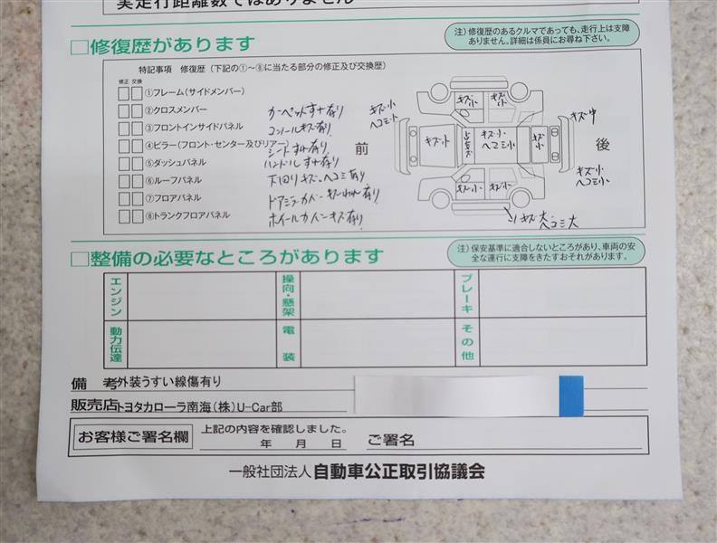 - 「修復歴あり」の場合、修復部位の詳細につきましては、販売店へお問合せください。