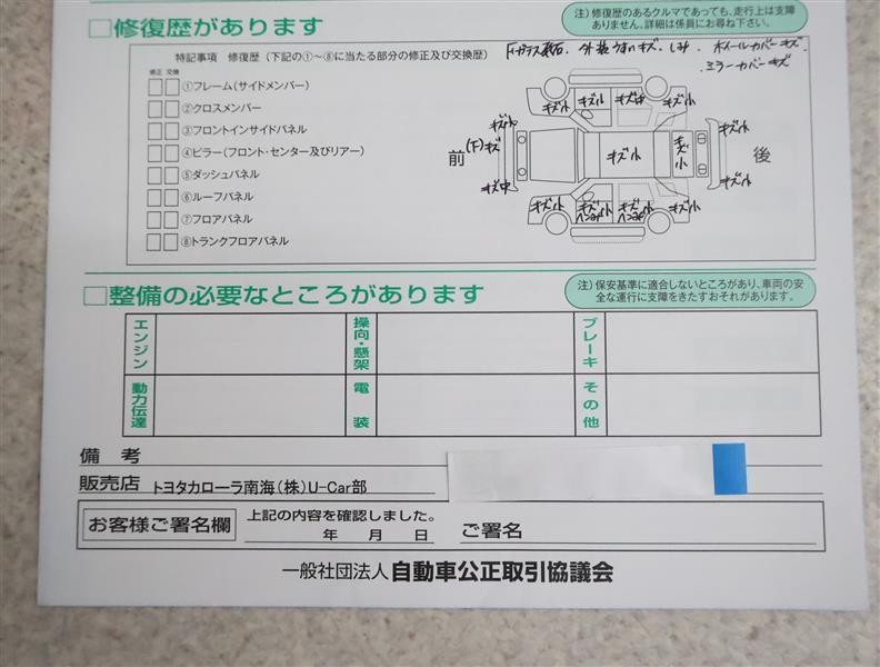 • 「修復歴あり」の場合、修復部位の詳細につきましては、販売店へお問合せください。